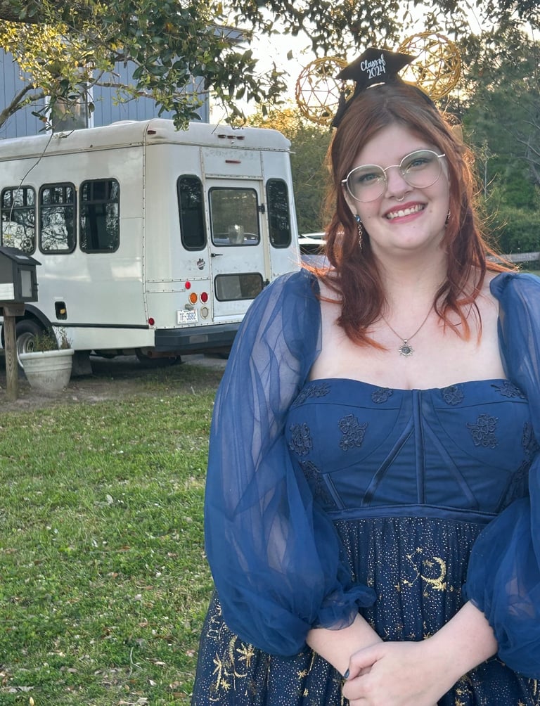Eliza is currently taking a gap year between graduating with an associate's degree before transferring to a four-year college to continue their education. They are using this time to self-reflect, grow, and curate their creative portfolio. They are currently located in Wilmington NC where they are converting a school bus into a tiny house to take on the road and become a mobile/ nomadic designer!
